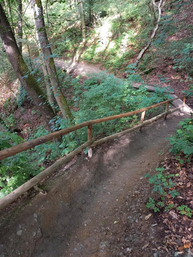 AANRADER: We hebben geparkeerd op P3 en dan is het een 32 minuten lopen naar de brug (de tijden op de kaart zijn vanaf P1). Zie de kaart voor de hele mooie route binnendoor bij de blauwe pijl. Dit lijkt wel een Schlucht en is alleen te nemen als je goed ter been bent en goede schoenen aan hebt. Anders kan je beter de blauwe stippellijn nemen, deze is geheel vlak.